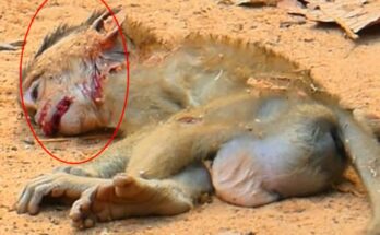 A tiny newborn monkey was discovered lying helpless on the forest floor, barely clinging to life. Its fragile body trembled with pain, and its face was so swollen that it …