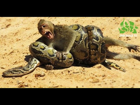 Las pitones acechan en silencio, enrollándose alrededor de un mono que ha bajado al suelo para buscar alimento, asfixiándolo antes de devorarlo entero.