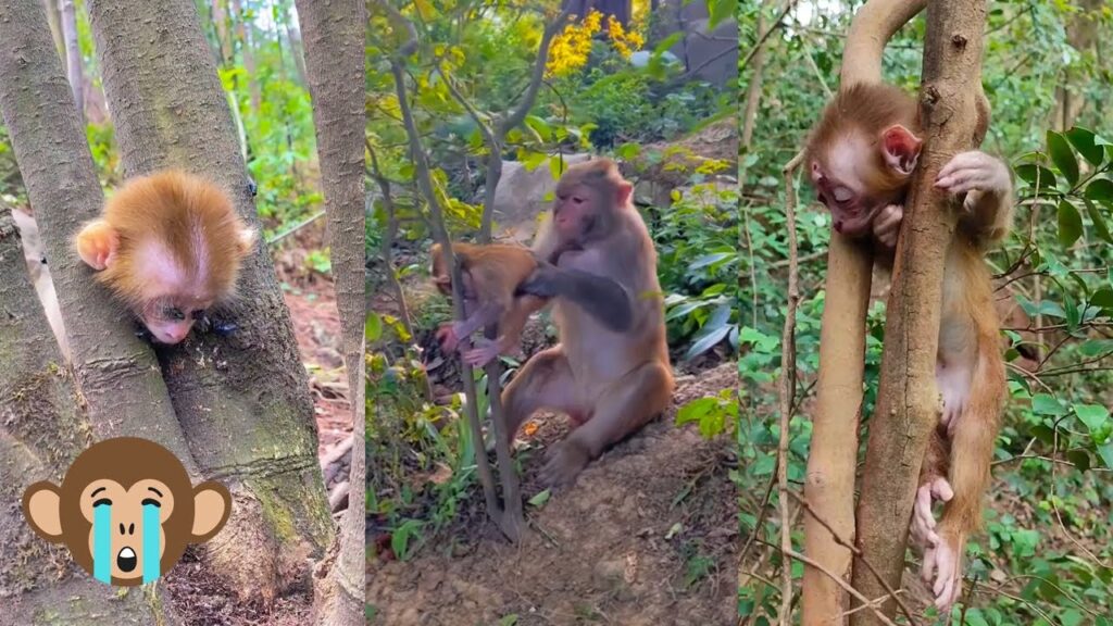 The baby whimpered, its small eyes wide with fear. The gap between the branches was too tight for it to move easily, and each attempt to wriggle out seemed to make it more frightened. The mother reached her baby, gently pulling at its arm while balancing carefully to avoid falling herself.
