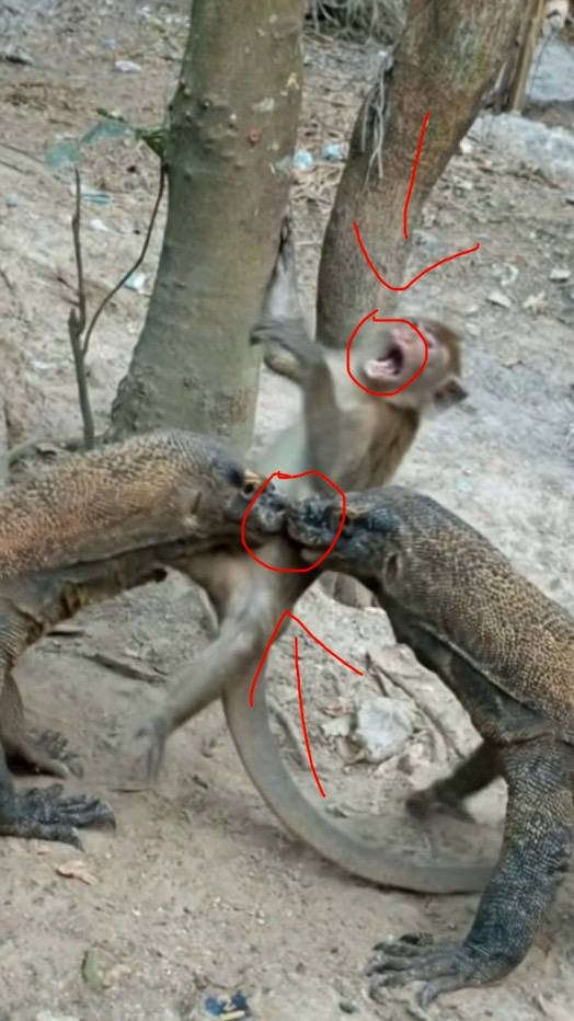 Heart pounding, the monkey clung to a branch, shaking uncontrollably. Below, the Komodo dragon circled, tongue flicking, sensing blood and fear. These predators are known to track wounded prey for hours—or even days. There was no escape in sight. 😰😰