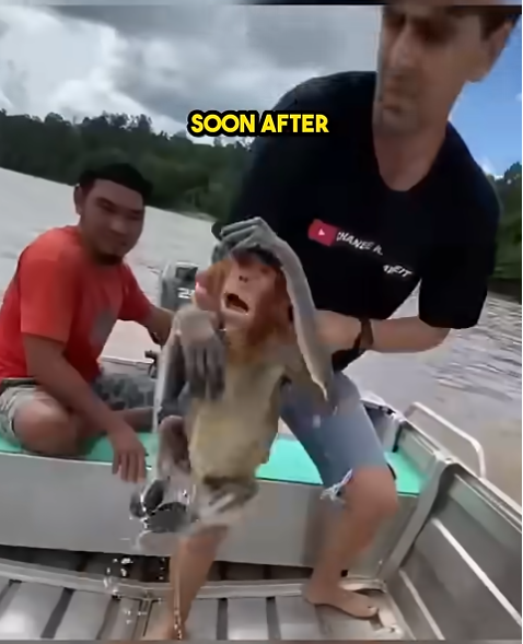 It all happened on a quiet afternoon when a passerby, who wishes to remain anonymous, heard frantic splashing and desperate cries near the riverbank. Curious and concerned, he rushed over and saw the small monkey clinging to a floating branch, barely managing to keep its head above water. Without hesitation, the man jumped into action.