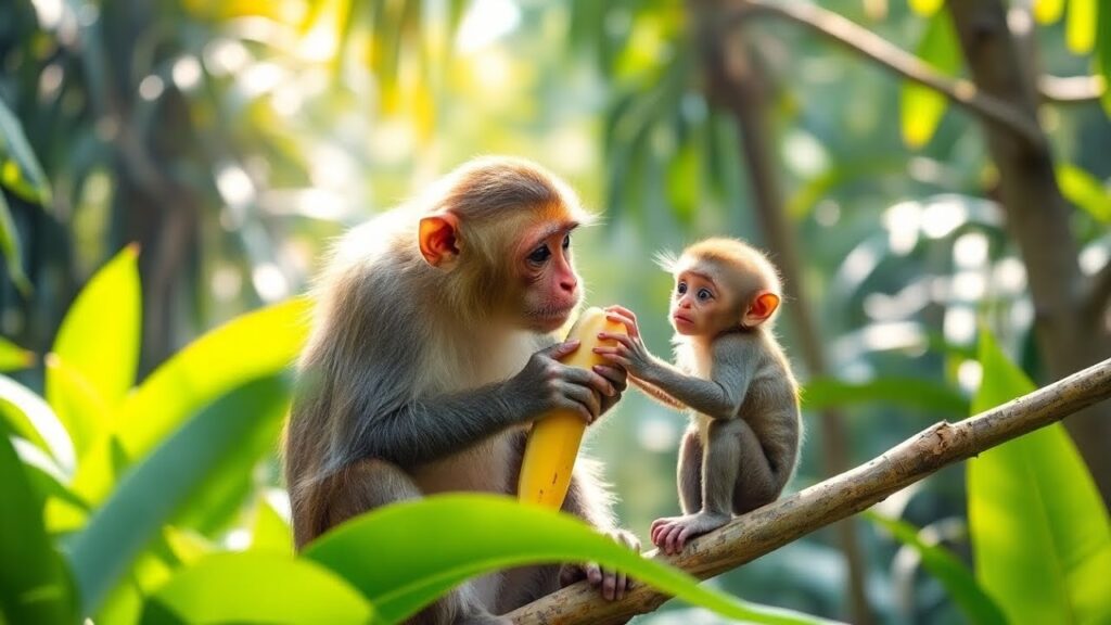 In the quiet heart of a tropical jungle, high up in the green canopy, lived a gentle mother monkey named Luma and her playful baby, Niko.
