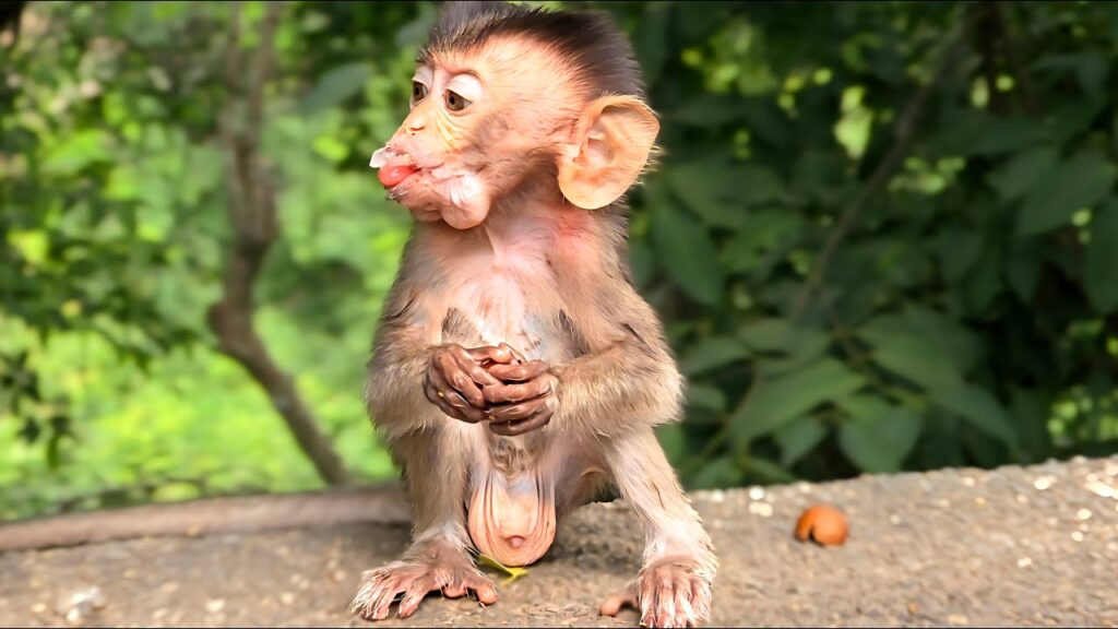 Nearby monkeys watched in amusement. Some tried to snatch a bite, while others simply stared in disbelief at how much this little one could fit in its mouth. The forest echoed with light-hearted sounds—the rustling of leaves, the chirps of birds, and the occasional giggle-like squeals from the monkey as it enjoyed its fruity adventure.